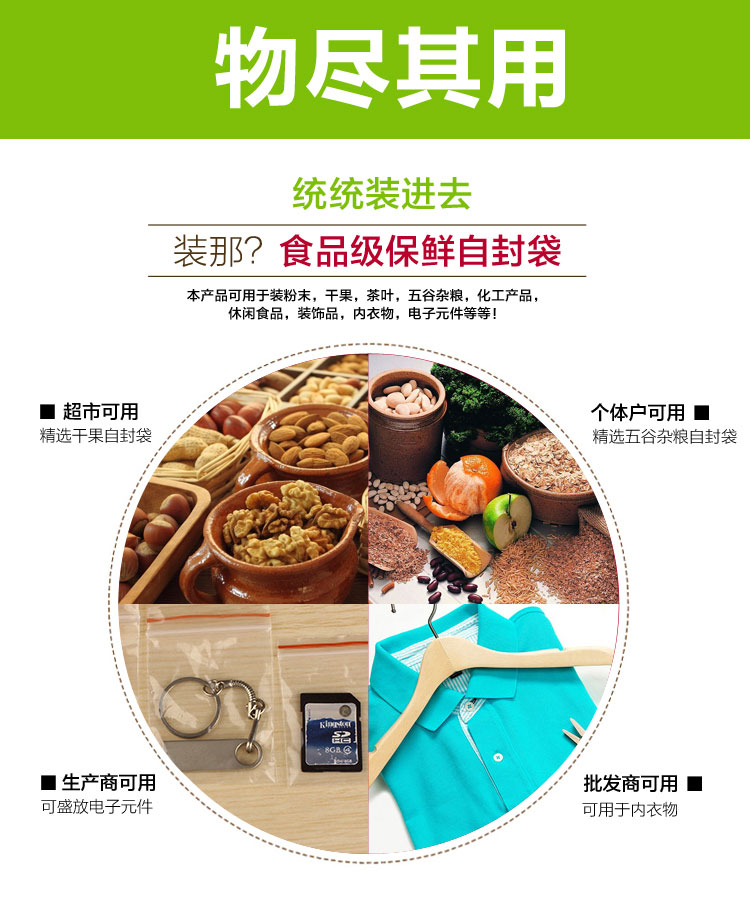 1.家庭方面用于包裝各類食品如蔬菜 水果 魚 肉及調(diào)味料等的保鮮專用袋 可放置冰箱 冰柜 冷藏 冷凍